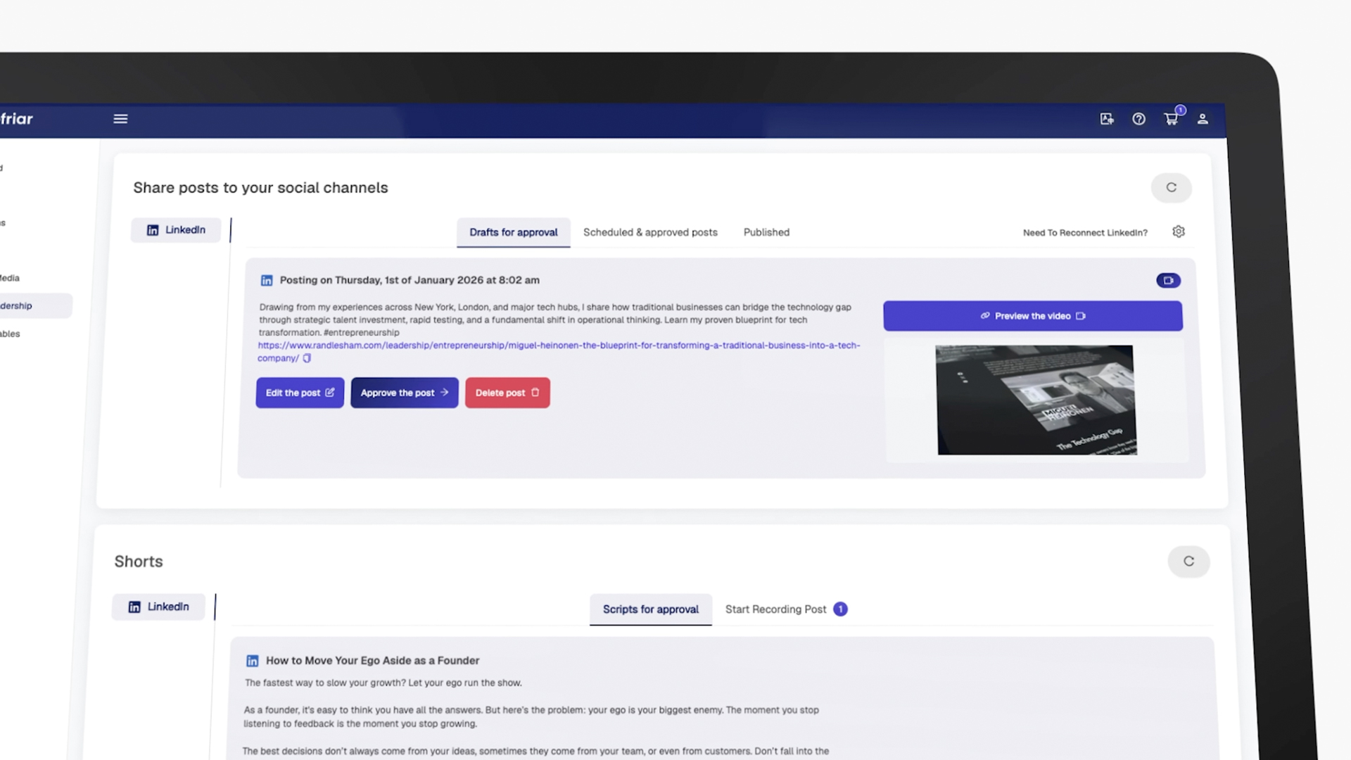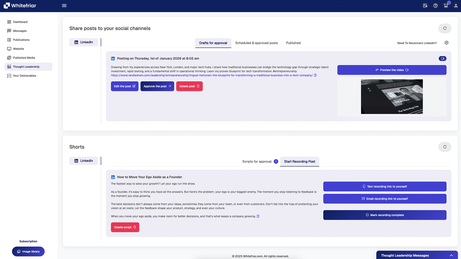 Executives who consistently show up on LinkedIn earn more trust, land more deals, and receive more speaking and board invitations. But writing content—or appearing on video—can feel overwhelming. That’s where Whitefriar comes in.